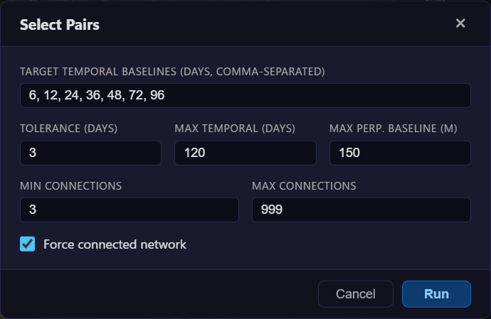 | Max Temporal | Hard upper limit on temporal baseline (days); pairs exceeding this are excluded |