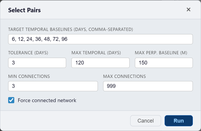 | Max Perp. Baseline | Hard upper limit on perpendicular baseline (m); pairs exceeding this are excluded |