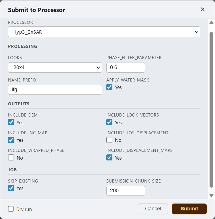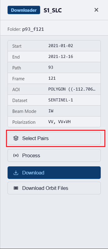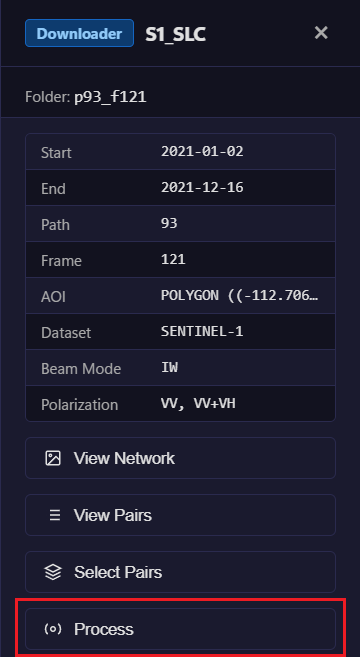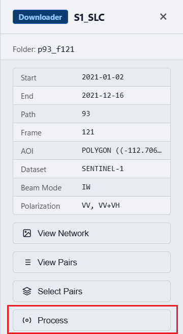 Click Process to submit interferogram pairs to HyP3.