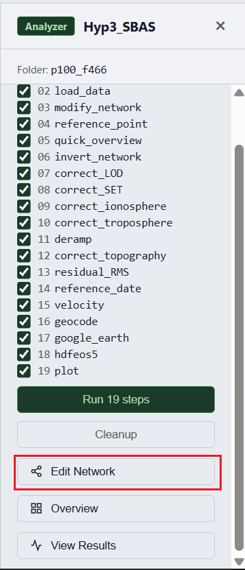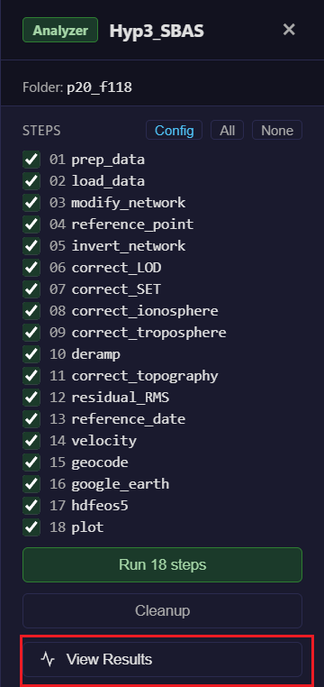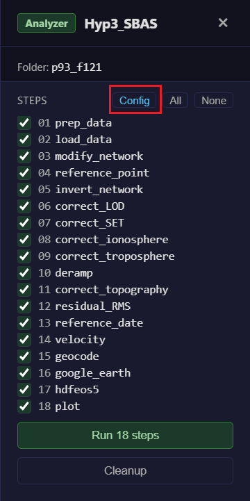 Once you enter the Analyzer panel, you can select the steps you want to run for time-series analysis. To adjust analysis parameters, click Change Config to switch to the configuration tab, where each analyzer type (e.g. Hyp3_SBAS) has its own independent settings that are saved separately.