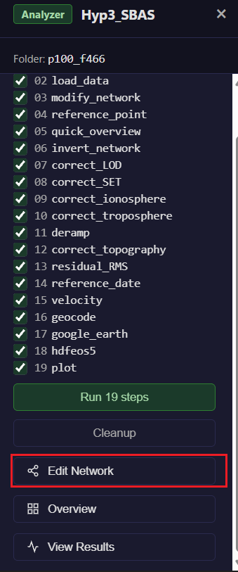 After initializing the analyzer and running at least the load_data step, an Edit Network button appears in the Analyzer panel. Click it to open the network editor showing the interferogram network currently loaded into MintPy, with coherence values overlaid on each edge.