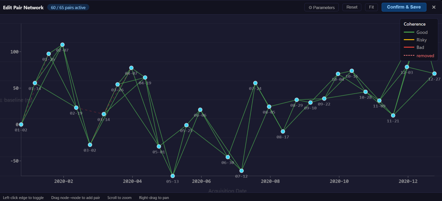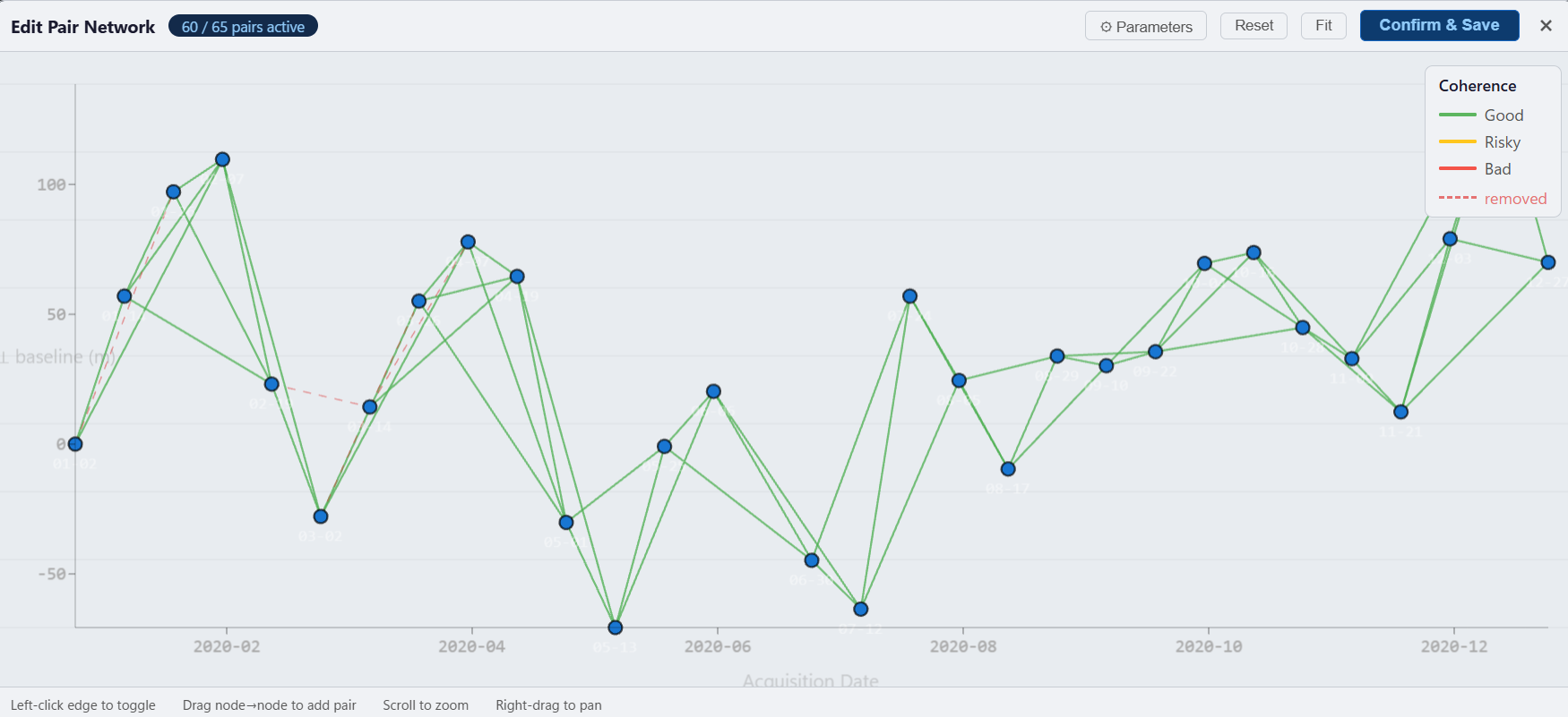 Unlike the pair selection stage, you cannot drag to create new pairs here — the interferograms have already been processed, so only the downloaded pairs are available. What you can do: