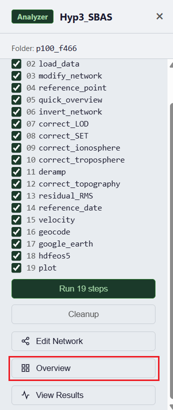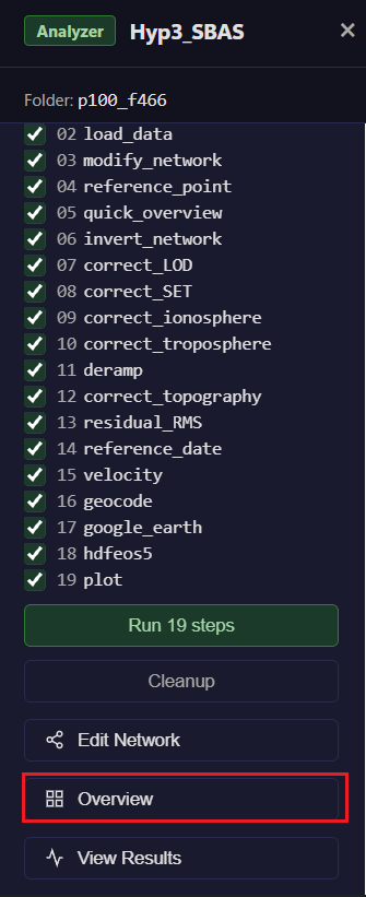 After running the reference_point and quick_overview steps, an Overview button appears in the Analyzer panel. Click it to open the Overview drawer, which lets you plot MintPy diagnostic layers directly on the map.
