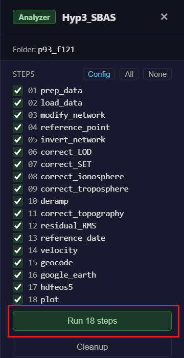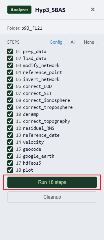 Click Cleanup to free disk space after analysis. This removes the temporary working directories (tmp/ and clip/) and any .zip archives in the job folder that were extracted during processing. MintPy outputs, and configuration files are preserved.