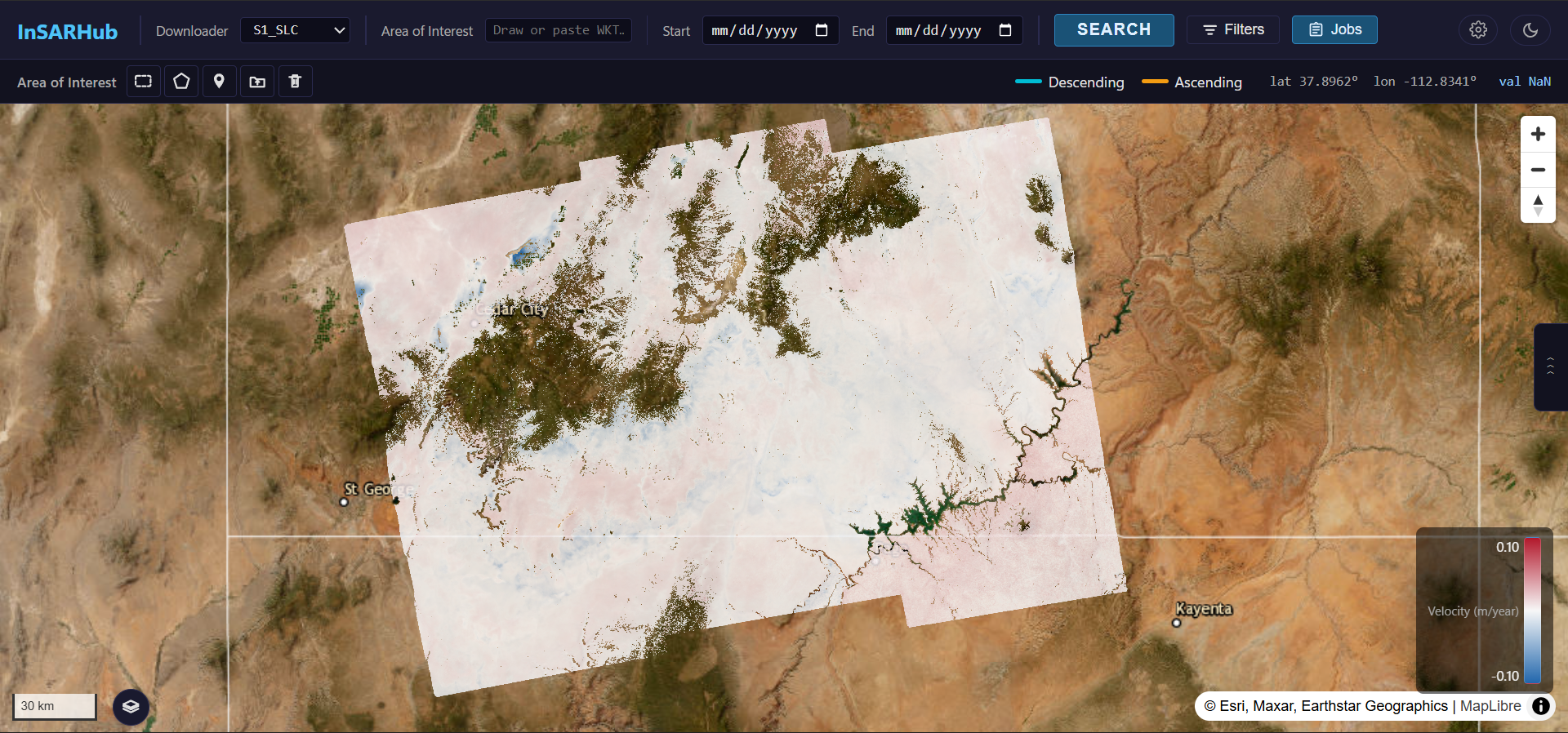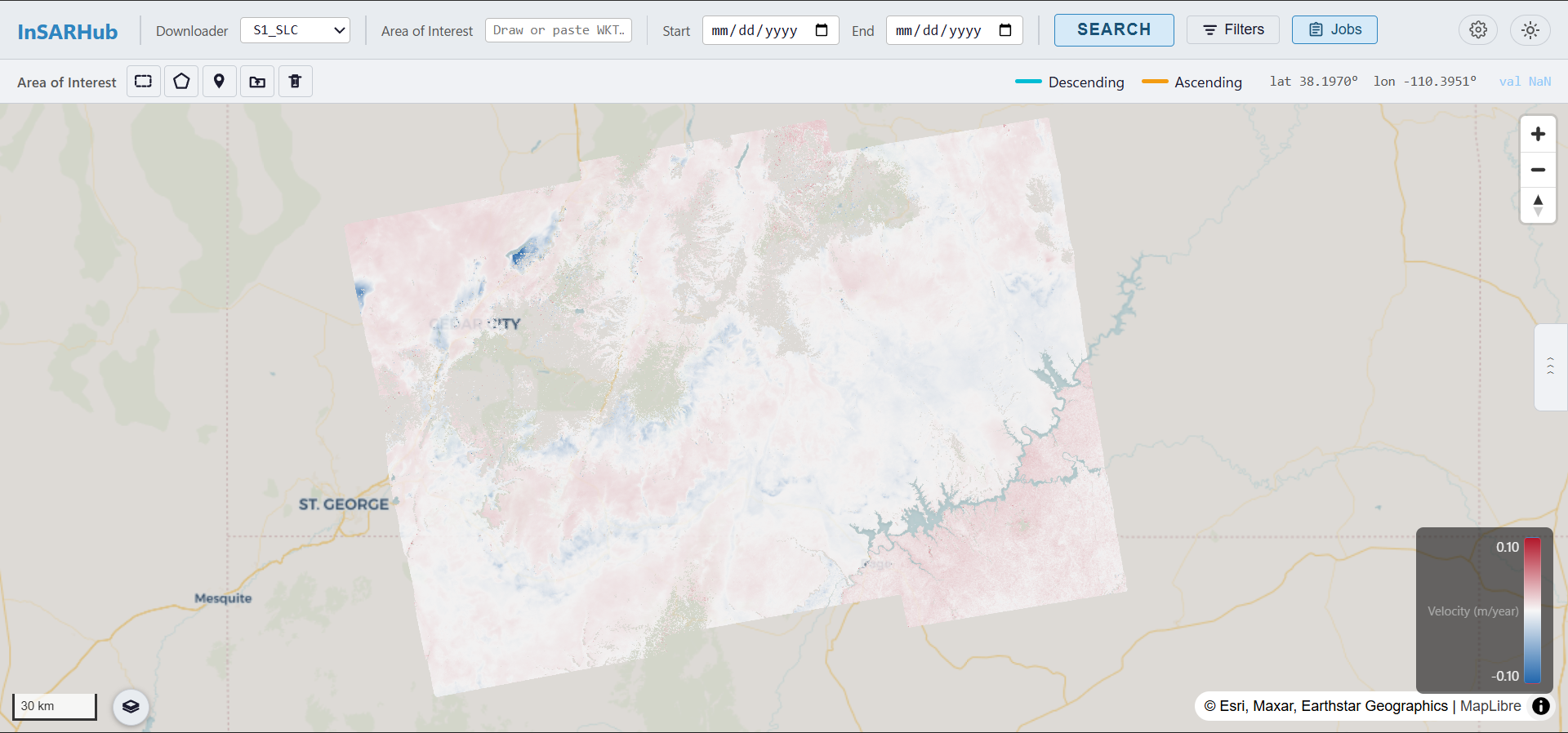 - Red — negative velocity (subsidence / moving away from satellite)